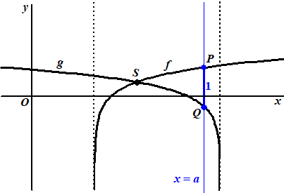 | Beide grafieken hebben een verticale asymptoot. Het punt S is het snijpunt van de grafieken van f en g. Zie de figuur. | |||