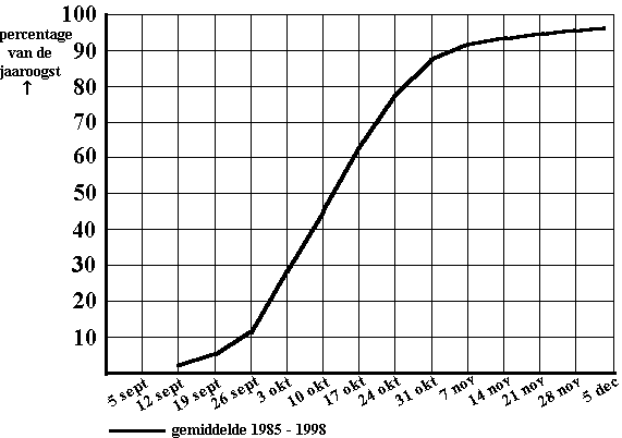 | Omdat de rode grafiek verder naar links ligt dan de zwart is eerder een hoger percentage geoogst en kunnen we dus spreken van een vroege oogst. | ||||||||||||||||||||||||||||||||||||||||||||