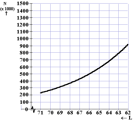 | Hoewel de formules (1) en (2) dezelfde aantallen passerende vliegtuigen opleverden in 2001, gaf de introductie van formule (2) aanleiding tot veel discussie. We gaan beide formules met elkaar vergelijken. In de figuur hieronder is voor formule (1) het verband tussen L en N getekend. Let op de bijzondere schaalverdeling op de horizontale as: de waarden van L nemen naar rechts af. | |||||