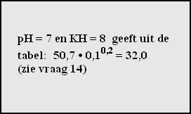 | Een vijverbezitter laat zijn vijverwater testen. Bij de test worden de volgende waarden gemeten: pH = 7 en KH = 8. Op basis van bovenstaande tabel kan de bijbehorende waarde voor C worden berekend. Vervolgens kan worden nagegaan of voldaan is aan de drie voorwaarden voor goede waterkwaliteit. | |||||||||||||||||||||||||||||||||||||||||||||||||||||||||||||||||||||||