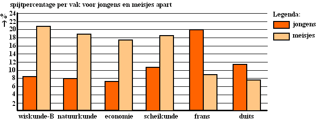 vakken ze zouden willen vervangen. Voor enkele vakken staat het resultaat in de figuur hieronder. Bijvoorbeeld: van alle meisjes met wiskunde B zou ongeveer 21% dat vak achteraf liever niet hebben gekozen. |