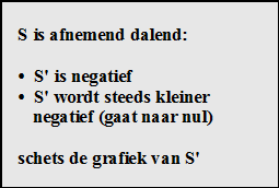 -0,5 • 49,47Z-1,5 S' = -24,735 • Z-1,5 S' = -24,735/Z1,5 Omdat Z > 0 is dit altijd negatief dus is S dalend. Als Z groter wordt, dan wordt Z1,5 ook groter dus wordt S' kleiner (negatief), en dat betekent dat de daling afneemt, dus dat S afnemend dalend is. |