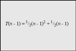 • (n - 1) = 3/2 • (n2 - 2n + 1) + 1/2n - 1/2 = 3/2n2 - 3n + 3/2 + 1/2n - 1/2 = 3/2n2 - 21/2n + 1. T(n) - T(n - 1) = (3/2 • n2 + 1/2 • n. ) - ( 3/2n2 - 21/2n + 1) = 3/2 • n2 + 1/2 • n. - 3/2n2 + 21/2n - 1 = 3n - 1 en dat is inderdaad K(n) |