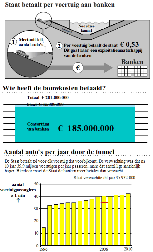 | Hieronder staan enkele infographics. Dat zijn figuren die de gemaakte berekeningen van het Financieel Dagblad toelichten. Met behulp van deze infographics kun je berekenen hoeveel meer de banken in de periode van 1996 tot 2026 betaald krijgen door de staat dan ze hebben uitgegeven aan de bouw van de tunnel. | ||||
