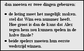 | 5p | 6. | Bereken de kans dat Wim en Alex elkaar in de halve finale ontmoeten. | ||