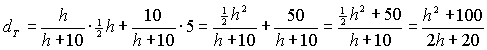 Dit is nul als de teller nul is: 2h2 + 40h- 200 = 0 geeft met de ABC-formule h = -10 + √200 of h = -10 - Ö200 De tweede oplossing valt af, want geeft negatieve h. Dus de oplossing is h = -10 + √200 |