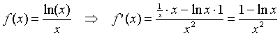 f'(x) = 0 geeft 1 - lnx = 0 ⇒ lnx = 1 ⇒ x = e dat geeft y = ln(e)/e = 1/e dus de top is het punt (e , 1/e) |