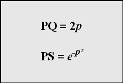 = PS geeft 2p = e-p² Y1 = 2X en Y2 = e^(-X^2) en dan intersect geeft p ≈ 0,41936 De oppervlakte is dan p2 ≈ 0,176 |