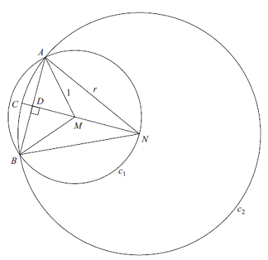 en middelpunt M. De twee cirkels snijden elkaar in de punten A en B. Zie de figuur hiernaast. Lijn MN snijdt cirkel c2 in