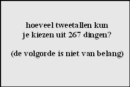 Hoeveel tweetallen kun je maken van 267 dialecten? Dat zijn er 267 nCr 2 = 35511 |