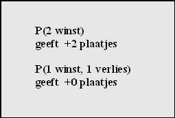 spelverlopen zijn: 8-7-5-3 en Yvonne wint er 2 5-3-8-7 en Yvonne wint er 2 8-3-5-7 en Yvonne wint er één en verliest er één 5-7-8-3 en Yvonne wint er één en verliest er één P(2 winst) = 0,5 en dat geeft +2 plaatjes P(1 winst, 1 verlies) = 0,5 en dat geeft + 0 plaatjes De verwachtingswaarde is dan 0,2 • 2 + 0,5 • 0 = +1 Na afloop heeft ze dan naar verwachting 3 plaatjes |