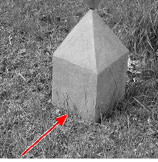 In de figuur hierboven zie je de hoogte van een achtvlak aangegeven. Deze hoogte is (bij benadering) gelijk aan 1,4142 maal de ribbe. Dit gegeven kun je gebruiken bij de volgende vraag. Op de foto hiernaast zie je de voet van het kunstwerk, met een ribbe van 20 cm. In de figuur hieronder is een begin gemaakt van een aanzicht van de voet van het kunstwerk op schaal 1:4. Als kijkrichting is de richting van de pijl op de foto genomen. |