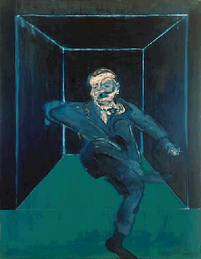 Op de foto zie je een schilderij van Francis Bacon. Een man bevindt zich voor een ruimte met donkere wanden. Het plafond en de vloer zijn in iets lichtere kleuren afgebeeld.Als je aanneemt dat deze ruimte balkvormig is, kun je zien dat de kunstenaar deze ruimte niet precies volgens de regels van het perspectief heeft getekend. |