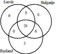basisgegevens staan in het venn-diagram hiernaast. De beide nullen komen omdat alle Bulgaarse letters ook in Russisch moeten staan. Bulgarije is in totaal 30, dus het overgebleven gebied in Bulgarije heeft 6 letters. Het totaal moet 39 zijn, dus in het rusland-servië deel moeten nog 39 - 24 - 6 - 6 - 3 = 0 letters staan |