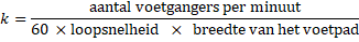 Om een beeld te krijgen van de drukte wordt uit de voorgaande cijfers de voetgangersdichtheid k berekend, het aantal voetgangers per vierkante meter: |