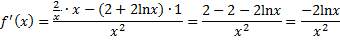 á0, ®ñ Nulpunten: f(x) = 0 Þ 2 + 2lnx = 0 Ù x ¹ 0 2lnx = -2 Ù x ¹ 0 lnx = -1 Ù x ¹ 0 x = e-1 = 1/e Ù x ¹ 0 Tekenbeeld van f: |