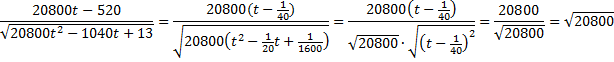 afgeleide: A = (20800t2 - 1040t + 13)0,5 v = 0,5 ((20800t2 - 1040t + 13)-0,5 (41600t - 1040) |