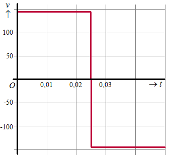 | c. | zie hiernaast. De snelheid is constant (ongeveer 144,22 km/uur, of om precies te zijn √20800) tot het moment van botsing (t = 0,025) (daarna zou de snelheid constant -144,22 worden, maar dat deel zal wel niet voorkomen, want er is immers een botsing) Waarom is v constant? De schuine zijde van de driehoek tussen auto-overweg-trein wordt constant kleiner omdat al die driehoeken gelijkvormig zijn (de snelheden zijn precies evenredig met de afstanden) |