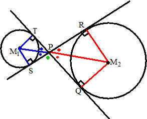 - 14x - 6y + 38 = 0 x2 - 14x + 49 - 49 + y2 - 6y + 9 - 9 + 38 = 0 (x - 7)2 + (y - 3)2 = 20 M1 = (7, 3) en r1 = √20 x2 + y2 + 16x - 6y - 7 = 0 x2 + 16x + 64 - 64 + y2 - 6y + 9 - 9 - 7 = 0 (x + 8)2 + (y - 3)2 = 80 M2 = (-8, 3) en r2 = √80 PM1 = √((xP - 7)2 + (yP - 3)2) PM2 = √((xP + 8)2 + (yP - 3)2) PM1 : PM2 = r1 : r2 geeft PM1 • r2 = PM2 • r1 √80 • √((xP - 7)2 + (yP - 3)2) = √20 • √((xP + 8)2 + (yP - 3)2) 80(xP2 - 14xP + 49 + yP2 - 6yP + 9) = 20 • (xP2 + 16xP + 64 + yP2 - 6yP + 9) 60xP2 - 1440xP + 60yP2 - 360yP + 3180 = 0 M1M2 is de lijn y = 3, dus ook yP = 3 Invullen geeft 60xP2 - 1440xP + 540 - 1080 + 3180 = 0 60xP2 - 1440xP + 2640 = 0 xP2 - 24xP + 44 = 0 xP = 22 ∨ xP = 2 Dus het punt P kan zijn (2, 3) of (22,3) en daarvan ligt het eerste punt tussen beide middelpunten in. M1P = 5 Als R het raakpunt is, dan geldt: 20 + RP2 = 25 ⇒ RP = √5 Cirkel door (2, 3) met straal √5: (x - 2)2 + (y - 3)2 = 5 x2 - 4x + y2 - 6y = -8 cirkels snijden; trek de vergelijkingen van elkaar af: 10x = 30 ⇒ x = 3 9 - 12 + y2 - 6y = -8 y2 - 6y + 5 = 0 (y - 5)(y - 1) = 0 y = 5 ∨ y = 1 Raakpunt (3, 5) geeft raaklijn PR: y = 2x - 1 Raakpunt (3, 1) geeft raaklijn PR: y = -2x + 7 y = 2x - 1 invullen in cirkel 2: x2 + (2x - 1)2 + 16x - 6(2x - 1) - 7 = 0 x2 + 4x2 - 4x + 1 + 16x - 12x + 6 - 7 = 0 5x2 = 0 Dat geeft maar één snijpunt (0, -1) dus deze raaklijn raakt ook aan cirkel 2. y = -2x + 7 invullen in cirkel 2: x2 + (-2x + 7)2 + 16x - 6(-2x + 7) - 7 = 0 x2 + 4x2 - 28x + 49 + 16x + 12x - 42 - 7 = 0 5x2 = 0 Dat geeft maar één snijpunt (0, 7) dus deze raaklijn raakt ook aan cirkel 2. |