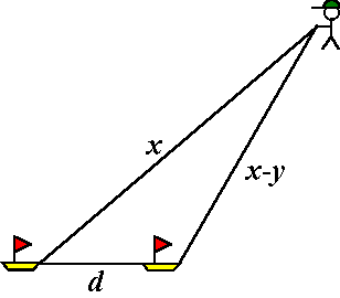 meter inneemt. Dan geldt de situatie hiernaast. De driehoeksongelijkheid levert d + x - y > x En daaruit volgt: d > y |