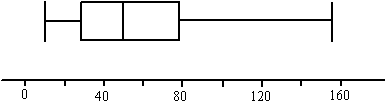 naar groot zetten: 10 10 14 15 15 16 20 20 25 28 32 32 34 34 40 45 45 46 48 50 50 50 54 54 60 65 65 72 75 78 81 82 87 90 90 92 128 145 156 Daar staan 39 getallen Mediaan = middelste = nummer 20 en dat is 50 (rood) 1e kwartiel = nummer 10 en dat is 28 (blauw) 3e kwartiel - nummer 30 en dat is 78 (blauw) Dat geeft deze boxplot: |