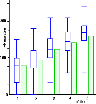 | c. | De tweede klas, want daar zit ongeveer een kwart van de boxplot boven de 120 minuten. | ||||||||||||||||||||||||||||||||||||||||||||||||||||||||