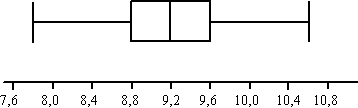 staafjes optellen: 1 + 2 + 5 + 5 + 5 + 9 + 9 + 11 + 14 + 11 + 8 + 7 + 1 + 1 + 1 = 90 (klopt: 1900 tm 1989) mediaan is nr 45-46 en dat is de eerste klasse van 11 hoog: 9,2 ºC Q1 is nr. 23 en dat is de eerste klasse van 9 hoog: 8,8ºC Q3 is nr. 68 en dat is de tweede klasse van 11 hoog: 9,6ºC Dat geeft de volgende boxplot: |