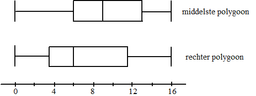 aflezen: 25% bij 6 = Q1, 50% bij 9 = mediaan, 75% bij 13 = Q3, maximum bij 16. Rechter figuur aflezen: 25% bij 3,5 = Q1, 50% bij 6 = mediaan, 75% bij 11,5 = Q3, maximum bij 16. Dat geeft de boxplots hieronder |