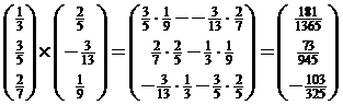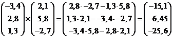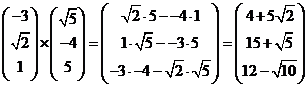 eerste en de tweede vector heeft de kentallen: 3 • -8 - 2 • 7 = -38 7 • -5 - 11 • -8 = 53 11 • 2 - 5 • -3 = 37 Het uitproduct van de tweede en de derde vector heeft de kentallen: 2 • -9 - -8 • 12 = 78 -8 • 7 - - 5 • -9 = -101 -5 • 12 - 7 • 2 = -74 De kentallen van de een zijn niet een aantal maal die van de ander, dus deze vectoren hebben niet dezelfde richting. De vectoren liggen daarom NIET in één vlak. |