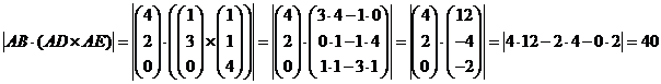 | 3. | De drie vectoren zijn AB en AD en AE dus de inhoud is bijv. | AB • (AD × AE) | | ||||
