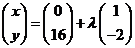 | e. | y = 16 - 2x heeft helling -2, dus 1 opzij 2 omlaag. Beginpunt is (0, 16) en samen geeft dat: | ||||