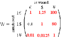 | 2. | a. | Zie hiernaast. 1€ = 1/0,8 = 1,25$ = 1,25 • 80 = 100¥ 1¥ = 1/80 = 0,0125$ = 0,0125 • 0,8 = 0,01€ |