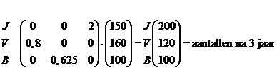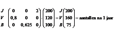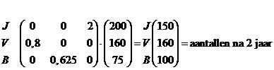 | c. | met 200 - 160 - X vogels geldt: Jnieuw = 2 • Boud dus als J gelijk blijft is 200 = 2 • B dus B = 100 Dan is Vnieuw = 0,8 • Joud = 0,8 • 200 = 160 Bnieuw = 0,625 • Voud = 0,625 • 160 = 100 Dat klopt: de aantallen blijven 200 - 160 - 100 Hij moet dus 100 oude vogels hebben |