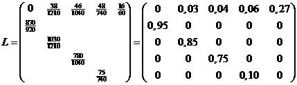 | 4. | De lesliematrix is de volgende (als 10 Jongen één volwassenen voortbrengen, dan brengt één Jonge gemiddelde 0,1 volwassenen voort): | ||||