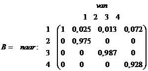 klasse 2, dus g1 = 300/302 = 0,993 en dan is dus b1 = 0,007 De 284 km2 klasse 2 op t = 0 is op t = 1 overgegaan in 278 km2 klasse 3, dus g2 = 278/284 = 0,979 en dan is b2 = 0,021 |